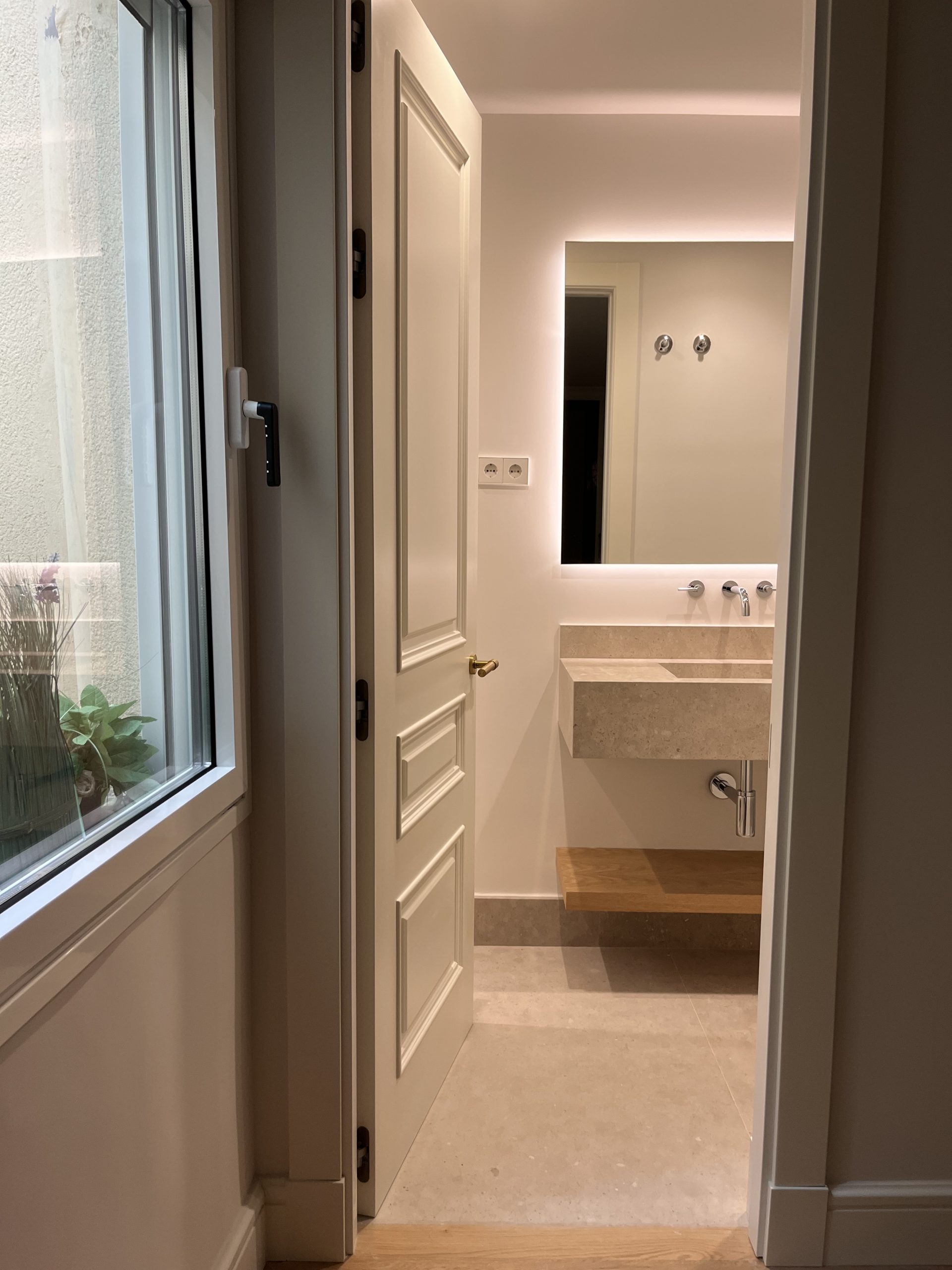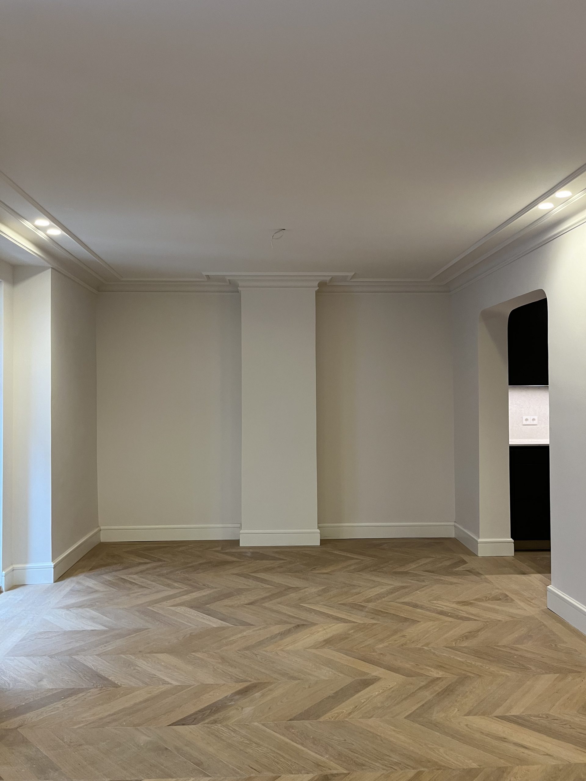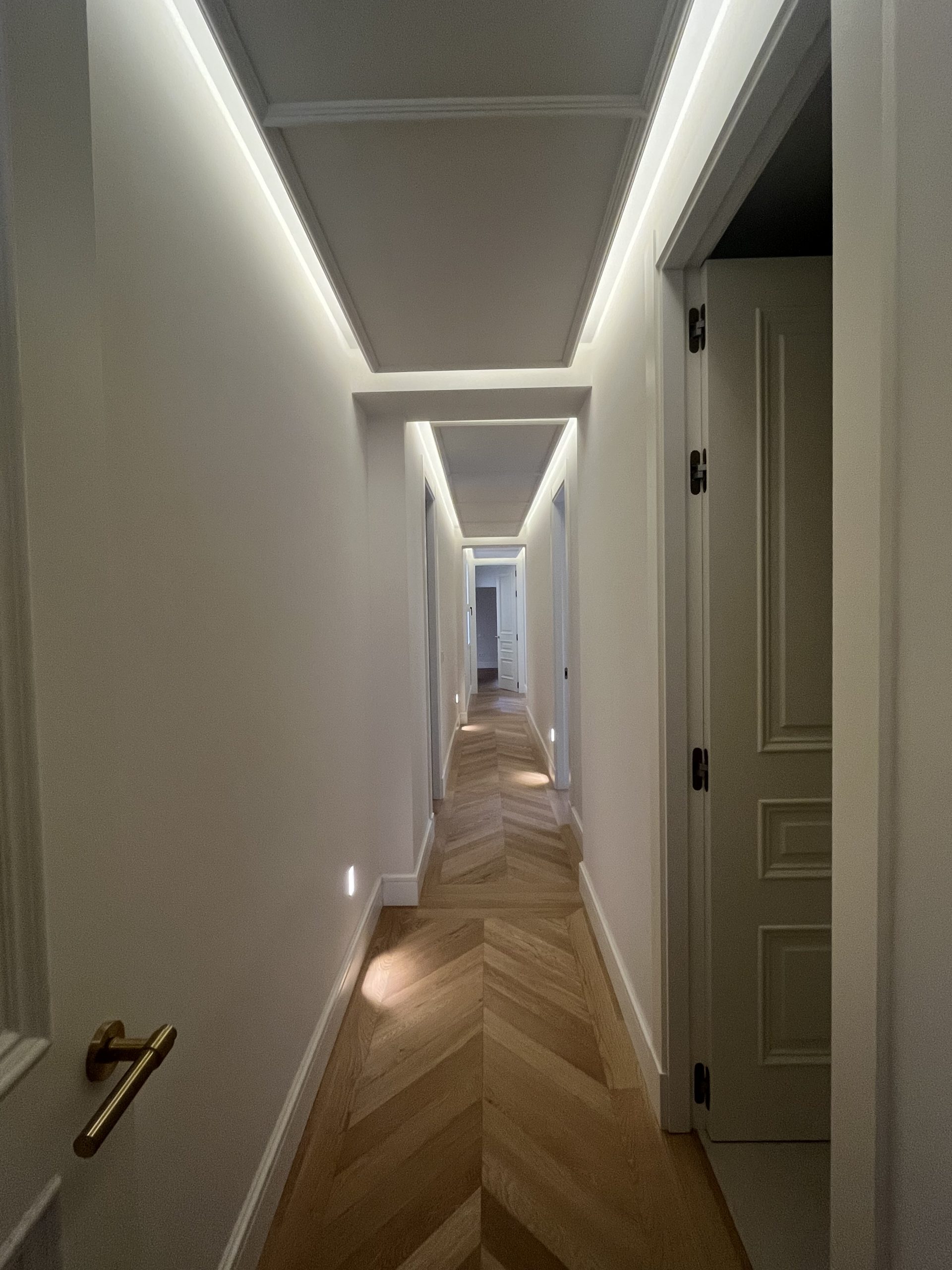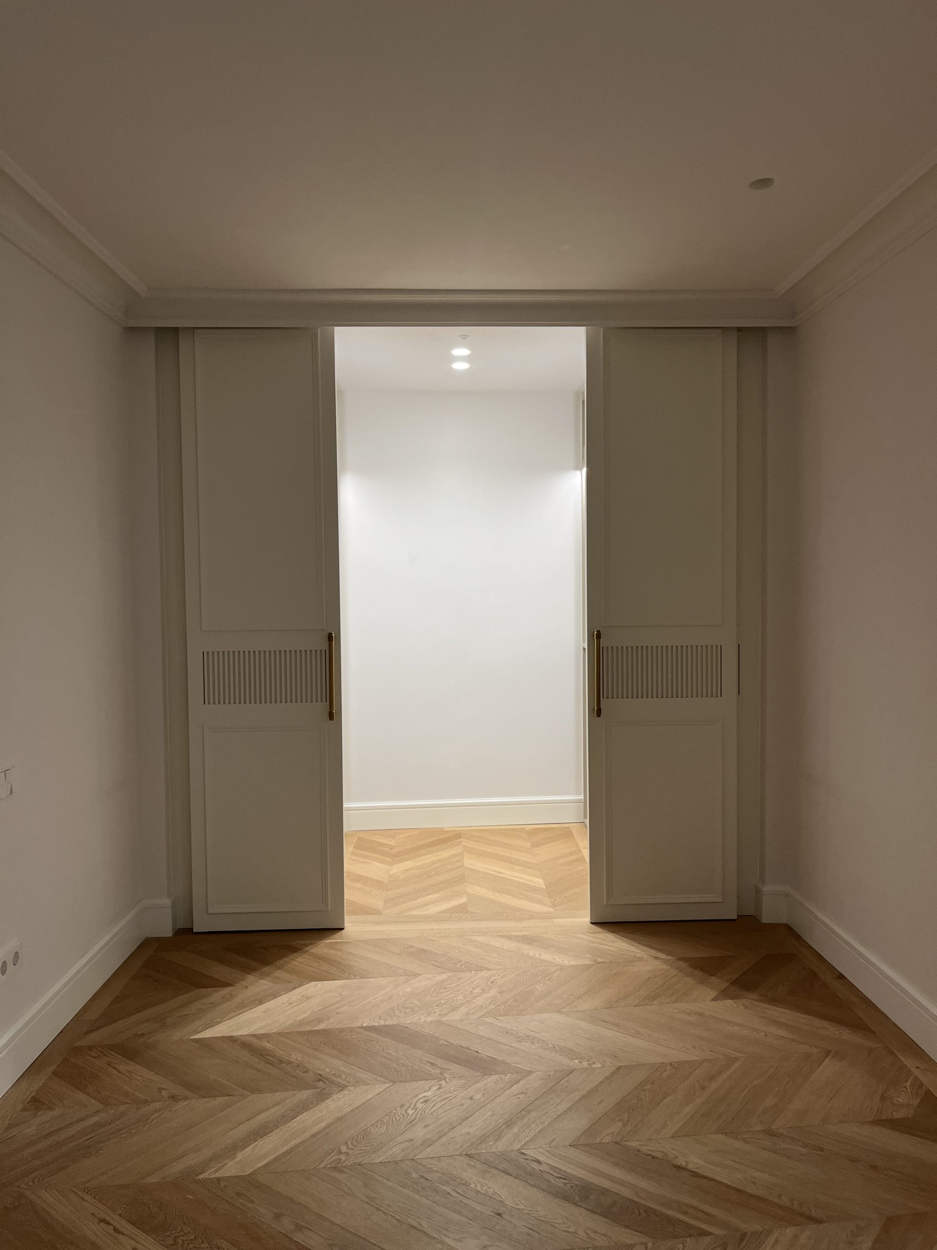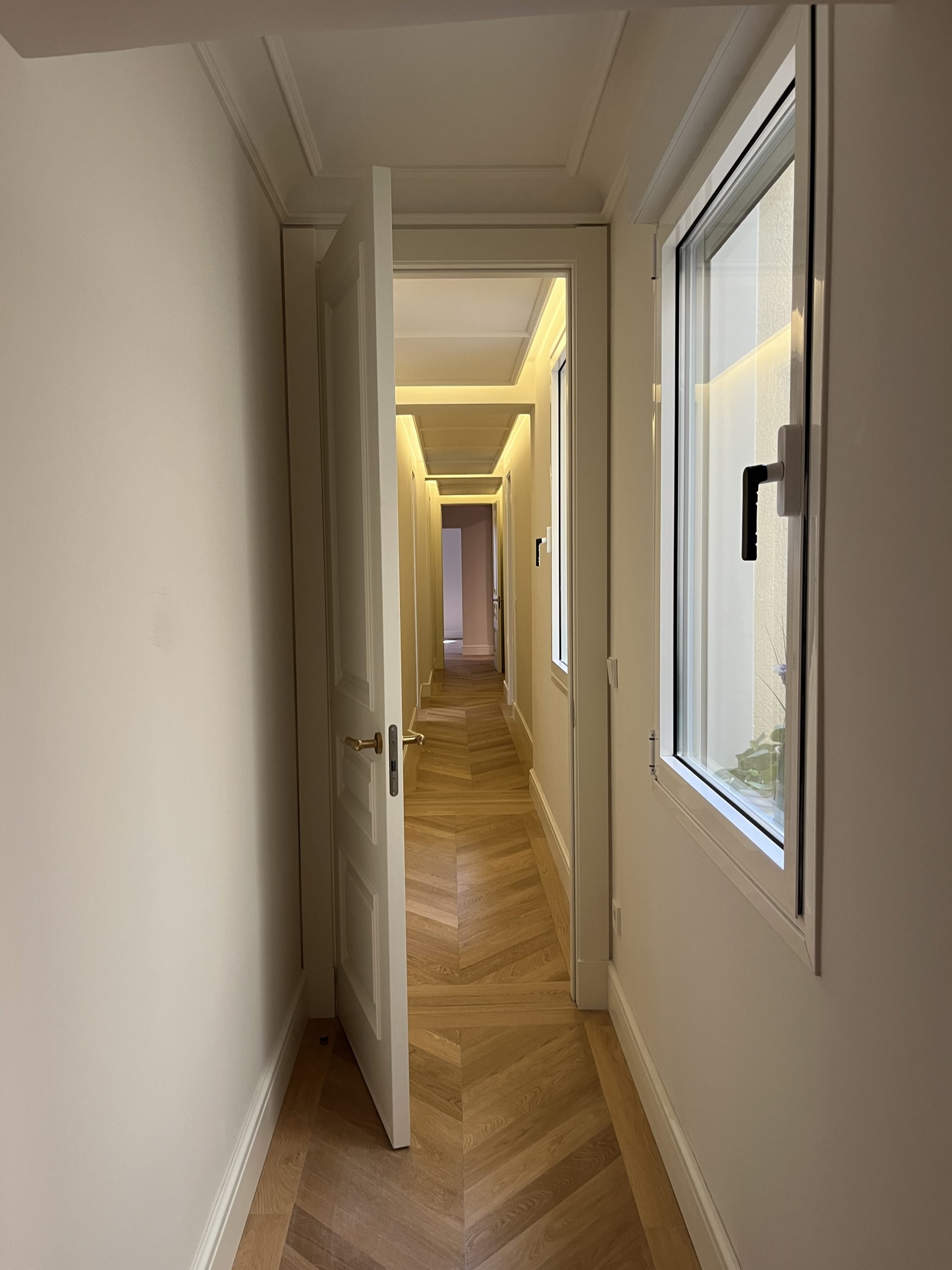 La estética clásica de la reforma, constituida por las molduras en techos, armarios y puertas y el suelo de madera en espiga, responde a la también clásica fachada del edificio.