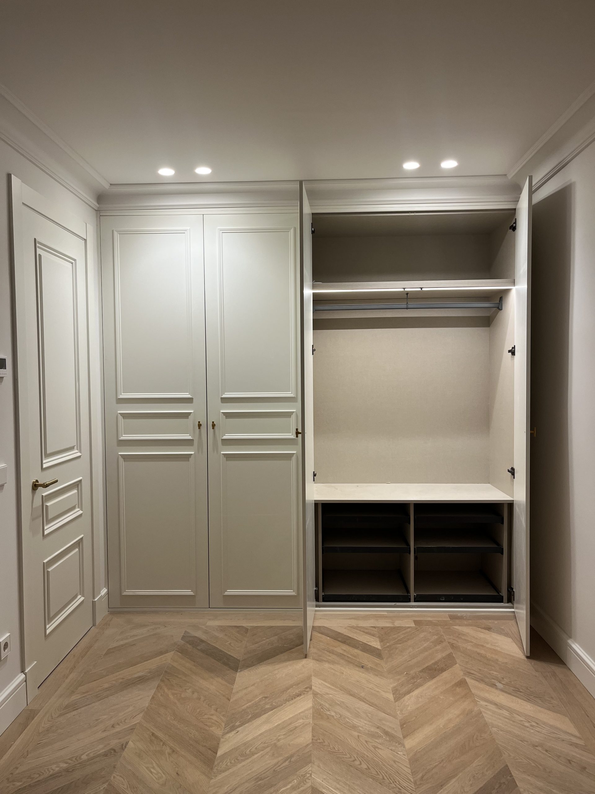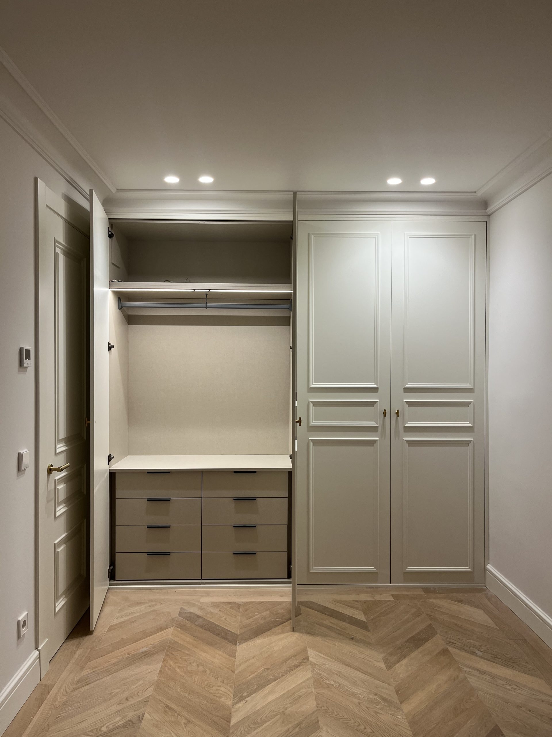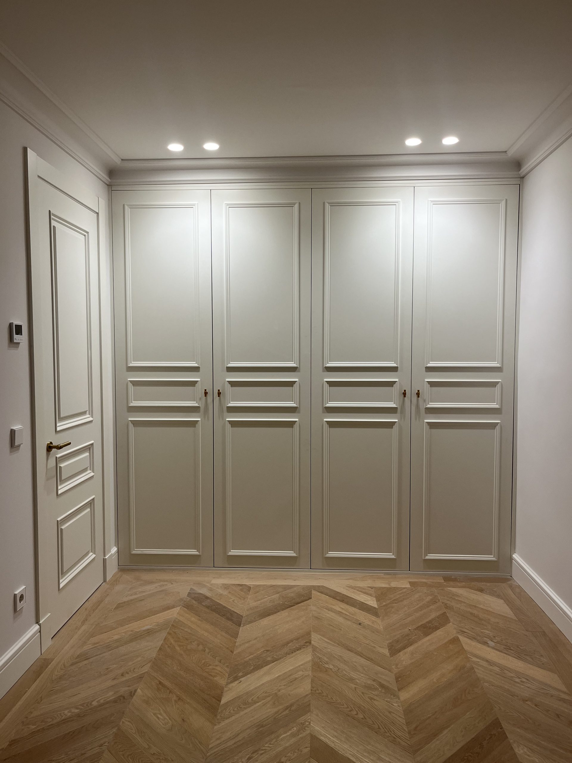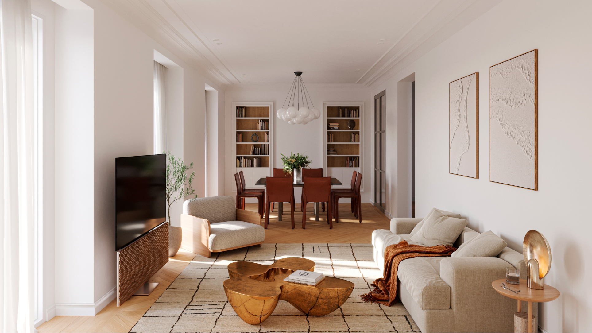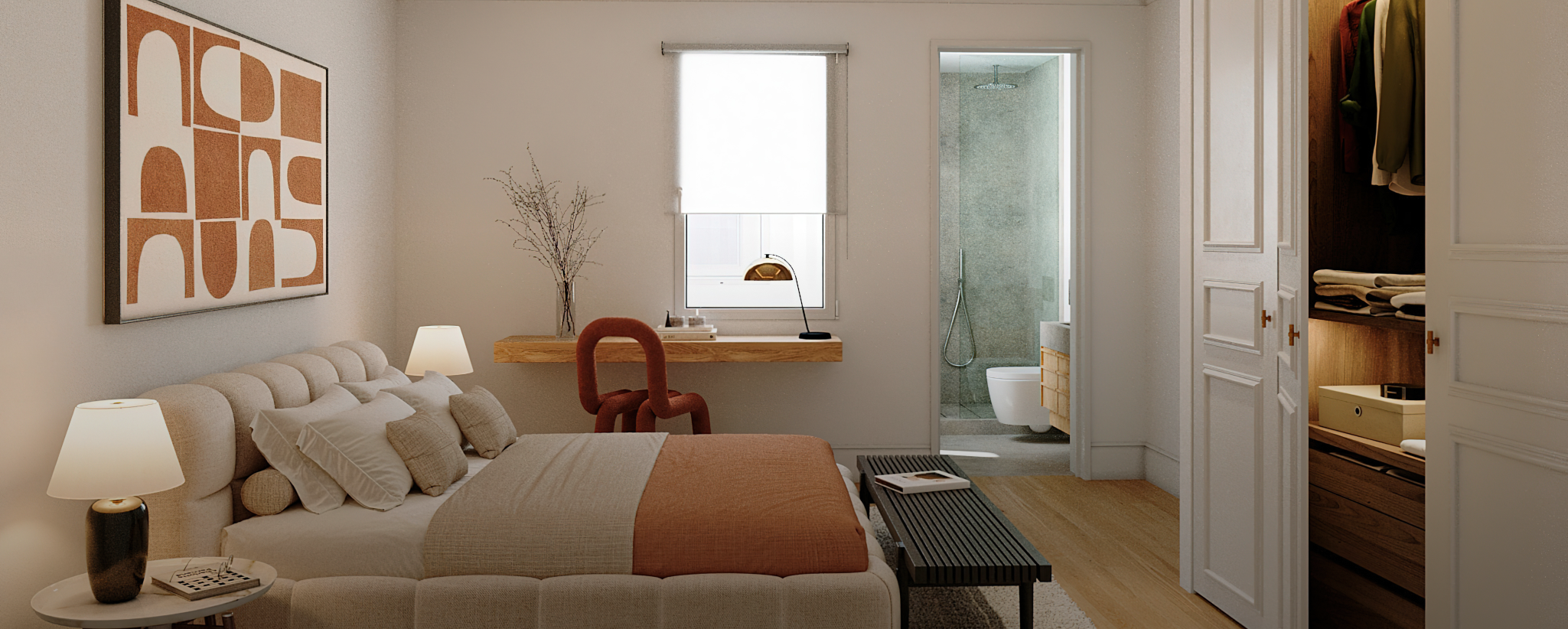 La estética clásica de la reforma, constituida por las molduras en techos, armarios y puertas y el suelo de madera en espiga, responde a la también clásica fachada del edificio.